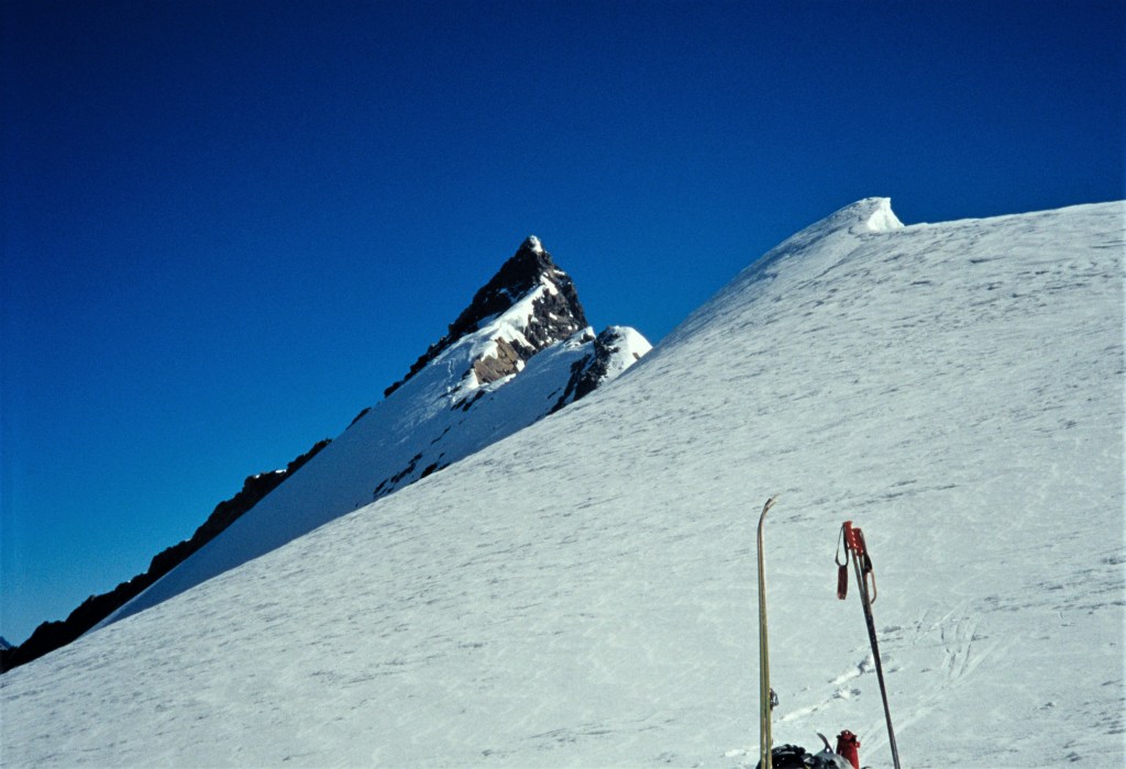 Da Rotenboden ci incamminiamo nel lungo traverso in discesa e quando ci affacciamo sul Gorner Gletscher ci avvediamo che bisognerà portare gli sci a spalle fino alla Monte Rosa Hütte. Brutta faccenda. Alberto, affetto da mal di schiena, comincia a maledire l’idea della tenda. Ma tant’è, ormai ci siamo. Il cielo parzialmente coperto ci evita almeno di arrostire. Dopo il lungo diagonale ci inabissiamo rapidamente fino al piede della morena, attraversiamo il Gorner Gletscher e poi il più ampio Grenz Gletscher, pestando ghiaccio grigio e pantanoso su cui scorrono rivoletti d’acqua. Faticando sulle corde fisse ci trasciniamo fin nei pressi del rifugio dove finalmente possiamo calzare gli sci. Fiancheggiando la morena ci innalziamo su neve fradicia fino a un ripiano, sopra i 3100 m, che abbiamo adocchiato già da lontano, alle pendici di un risalto.