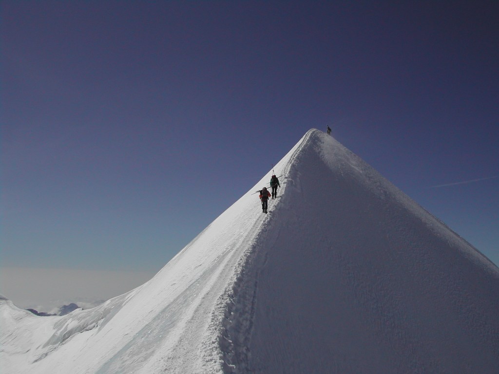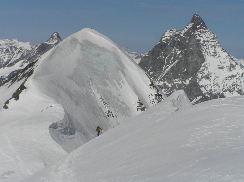 Breithorn Occidentale, 4165 m. Salita: via normale dal versante sud; discesa: sul Bivacco Rossi Volante (Valtournenche, Val d’Ayas); con gli sci.