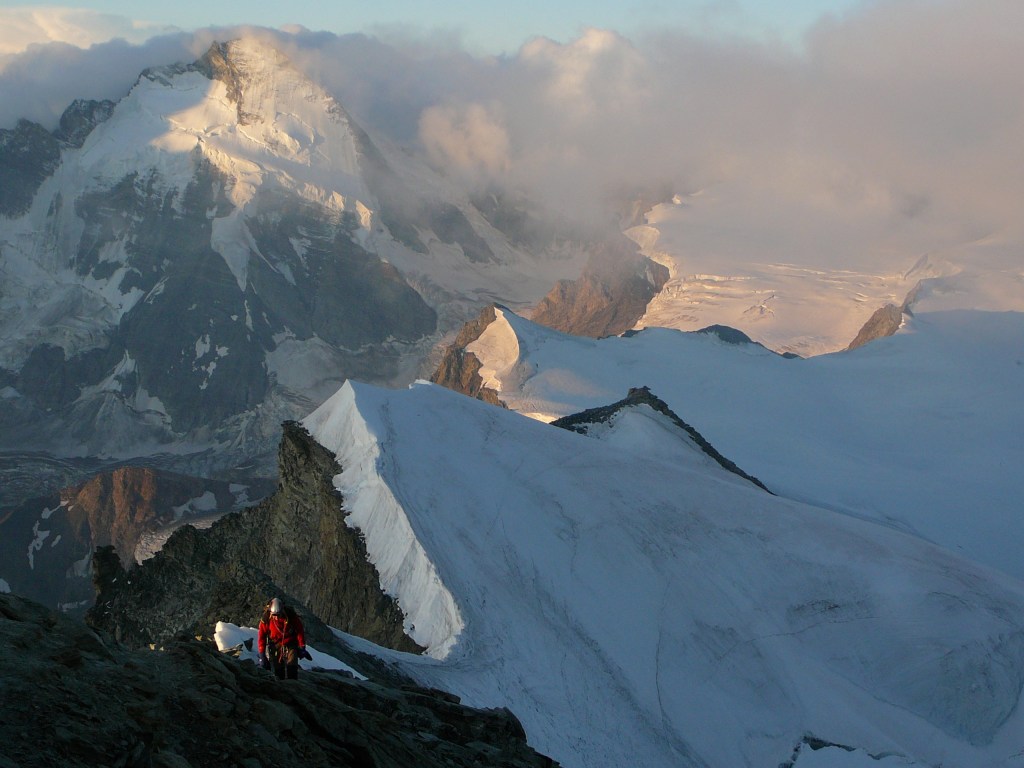 Salita: Dal rifugio iniziare a salire la cresta rocciosa (o di misto) alle spalle della capanna. Seguirla stando a destra del filo, in vista della tubatura in gomma per l’acqua del rifugio. Poco dopo l’inizio della cresta, puntare a delle liste di granito chiaro alte alcuni metri. Verso la fine del risalto, dove la cresta diviene orizzontale ed esposta per una quindicina di metri, passare a sinistra e traversare appena sotto il filo su una paretina verticale fornita di buoni appoggi, uscendo su una terrazza con grosso ometto (dsl. ~120 m, passaggi di II-II+). Continuare sulla successiva cresta di neve (Weissgrat), stretta e con pendenza sui 40°, che conduce alla spalla glaciale della Wandflueluke, 3700 m (dsl. ~80 m). Attraversare il successivo ripiano nevoso fino alla base di una cresta, rocciosa o di misto, che delimita a sinistra uno scosceso salto triangolare. Superata l’eventuale crepaccia terminale, salire la cresta per blocchi e cengette (dsl. ~130 m) e poco prima del suo termine tagliare a destra lungo una cengia poco marcata per sbucare sul bordo di una conca (ometto, ~3850 m), da cui ha inizio un’altra breve cresta nevosa. Percorrerla scavalcandone la massima elevazione (~3900 m) per discendere ad una successiva forcella, tenendosi a distanza dalle cornici del versante est. In alternativa attraversare in leggera discesa il pendio di sinistra puntando direttamente alla forcella (più ripido ed esposto). Dalla forcella salire la successiva cresta rocciosa (o di misto) rimanendo presso il filo. Oltrepassare una prima sommità rocciosa e dirigersi ad un successivo risalto. Aggirarne il culmine con un corto traverso a sinistra in leggera discesa, giungendo ai piedi del Gran Gendarme (~4000 m). Traversare orizzontalmente a sinistra verso la base di un caratteristico gendarme secondario, su placche inclinate e cengette, scavalcando una cordonatura di grandi blocchi e ponendo piede nel colatoio canale che scende dalla forcella a monte del Gran Gendarme. Innalzarsi nel canale per cengette e saltini, quindi seguire la direttrice di tre fittoni infissi a distanza più o meno regolare di 30 m (dopo il primo fittone si trovano anche uno spit e poi un cordone, II-II+). Giungere sulla forcella a monte del Gran Gendarme con un ultimo passaggio leggermente strapiombante ma fornito di grosse prese (III+, fittone sulla forcella). Proseguire lungo la cresta per una larga fessura su placca abbattuta, quindi percorrere un tratto orizzontale e poi in discesa giungendo ai piedi di un caratteristico gendarme parallelepipedo, strapiombante sul lato destro (il Secondo Gendarme). Ignorando eventuali cordoni, uno alla base dello spigolo destro del gendarme e l’altro sulla forcella immediatamente a monte dello stesso, traversare a destra un pendio delimitato a destra da una crestina secondaria di rocce grigie. Salire per cenge e blocchi nei pressi di questa cresta secondaria fin quasi alla sua congiunzione con quella principale. Scavalcare la cresta secondaria e continuare a traversare a destra in leggera salita, rimanendo una decina di metri al di sotto del filo della cresta principale (esposto), puntando ad una forcella della cresta stessa alla base di una successione di piccoli ma evidenti gendarmi gialli, indicati genericamente come ‘Terzo Gendarme’. Da questa forcella passare sul versante Ferpecle (sinistra) e traversare orizzontalmente per 35-40 m (esposto, II-II+) in direzione di una quinta di rocce scure che si protende nel versante Ferpecle (l’ultimo risalto roccioso della cresta visibile da qui). Giunti in una zona di placchette grigie, gradinate ma rovesce, salire sotto la verticale di un diedro (chiodo, II-III; più in alto sono individuabili anche due cordoni per calata, uno a destra e l’altro a sinistra). Dal chiodo, scalare direttamente le rocce grigie soprastanti superando un breve strapiombo fornito di grosse prese, protetto da uno spit (III+). Proseguire nel successivo diedro aperto di colore scuro (III, uno spit), fino ad un ultimo spit di sosta con maillon alla base di uno strapiombino (un altro spit con cordone e maillon è posto più in basso e a sinistra del precedente). Contornare lo strapiombino a sinistra e per cengia ascendente giungere nuovamente sul filo di cresta, al termine delle difficoltà. Seguire ora la cresta superando facilmente un torrione tozzo e abbattuto e poi un risalto di curiosa roccia biancastra, frantumato e scalinato. Si giunge così (~4270 m) all’ultimo tratto di cresta, più o meno innevato a seconda della stagione, che si sale senza difficoltà tenendosi a distanza dalle eventuali cornici, fino alla croce di vetta, 4357 m (5-6 ore).
