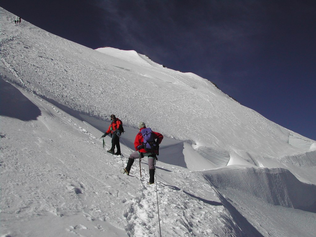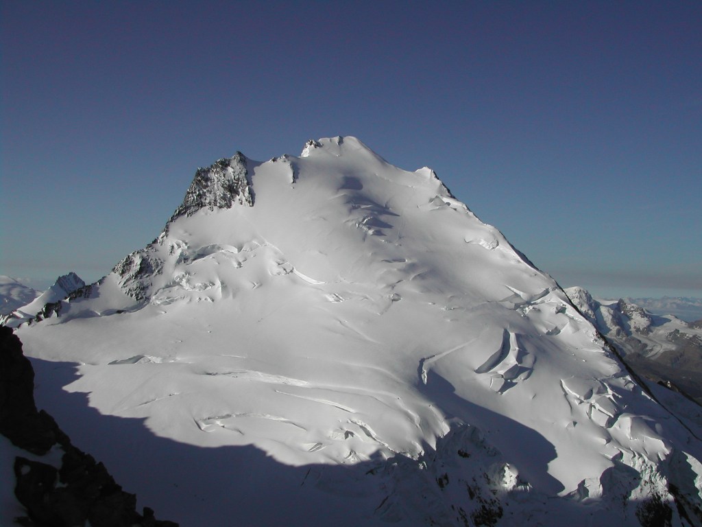 Mentre traversiamo sotto l’imponente seraccata, alte velature coprono per lunghi momenti il sole, che infine ha la meglio e sui candidi pendii glaciali, interrotti solamente da qualche facile crepaccio, brilla la neve fresca caduta ieri. Il vento solleva uno sfolgorio di cristalli contro il cielo ora perfettamente azzurro. Uno spettacolo. La catena della Nadelgrat è a un passo, poco più lontana la larga piramide isolata del Wheisshorn e, spostando lo sguardo di qualche grado, le tetre pareti nord del Cervino e della Dent d’Hérens.
