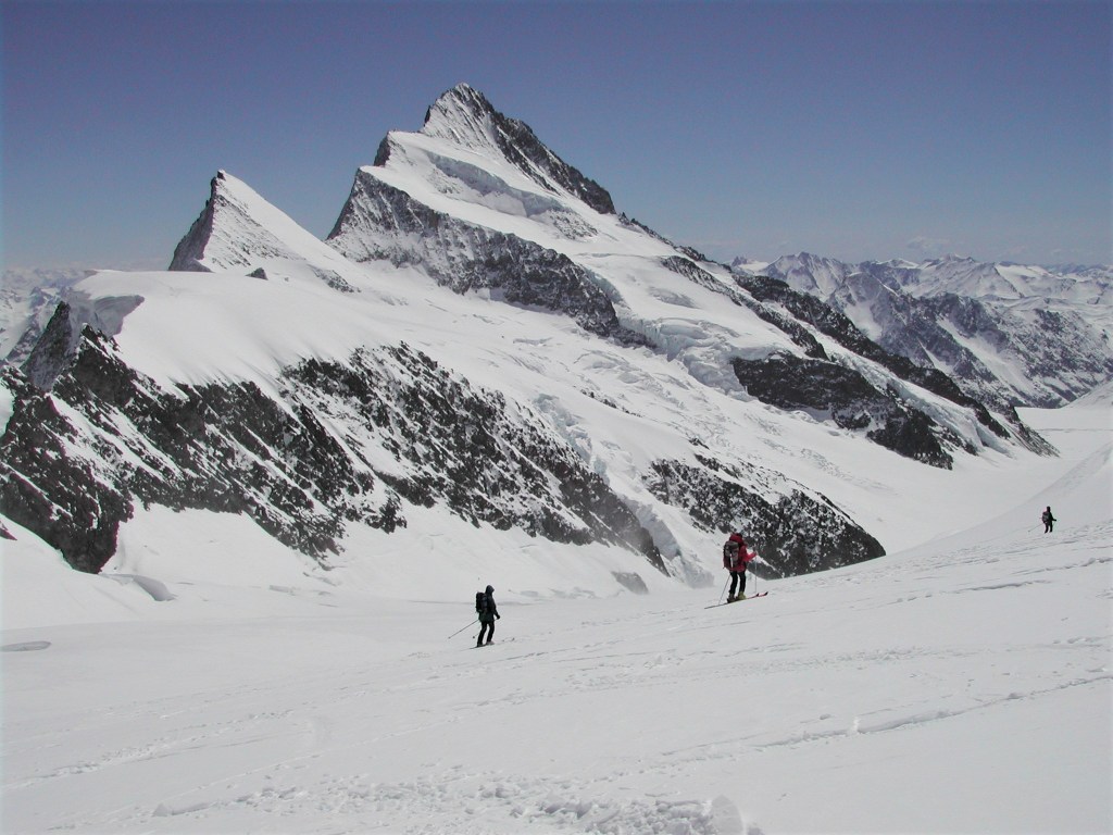 Hinter Fiescherhorn, 4025 m. Salita: via normale per la cresta nord-ovest dalla Mönchsjoch Hütte; discesa: via normale sulla Finsteraarhorn Hütte (Valle della Lutschine, Oberland); con gli sci.