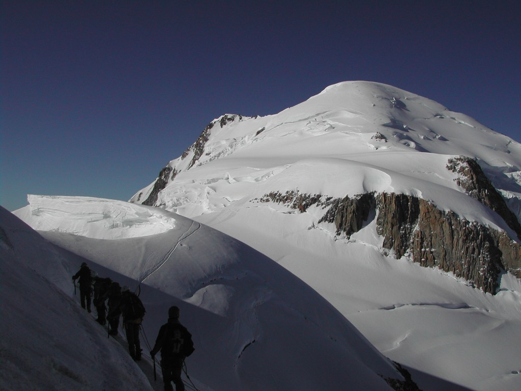 Discesa: La discesa qui descritta segue la via dei Grands Mulets che, con le altre vie normali da questo versante, ha in comune la Cresta delle Bosses, facile e soltanto in qualche punto un po’ stretta e ripida. Si passano La Tournette, poi La Petit e La Grande Bosse (le ‘gobbe’ gemelle che danno il nome alla cresta) giungendo allo spuntone roccioso dove sorge il bivacco Vallot (4362 m, 1.15 ore). Da qui abbassarsi fin nei pressi del Col du Dôme, 4246 m, e prima di toccarlo svoltare a destra e scendere sul Grand Plateau (circa 4000 m, tracce sempre presenti nella buona stagione). Attraversato il vasto catino nevoso, si piega a nord e si segue un corridoio che, restringendosi, si affaccia su un ripido pendio, Les Grandes Montées. Discenderlo e attraversare velocemente il successivo Petit Plateau, 3650 m, esposto ai seracchi del Dôme du Goûter (pericolo di caduta di blocchi di ghiaccio). Si incontra un tratto nuovamente a forte pendenza, Les Petit Montées, poi una stretta fascia crepacciata che va superata a ridosso della cresta nord del Dôme, al termine della quale si traversa diagonalmente a destra pervenendo ai piedi del roccione su cui sorge il Refuge des Grands Mulets, 3051 m, visibile già dall’alto (1.45 ore). Sotto il rifugio una zona fortemente crepacciata e ripida obbliga a numerosi zig-zag. Al suo termine, ad una quota di 2650 m circa, volgere in direzione nord-est ed attraversare La Jonction, tratto grosso modo pianeggiante ma estremamente tormentato alla confluenza dei ghiacciai dei Bossons e di Taconnaz, che va percorso contornando o scavalcando costruzioni di ghiaccio le più varie, fino ad uscire, intorno ai 2600 m, nei pressi del canalone che scende dal Glacier Ronde, sul versante occidentale della Aiguille du Midi. Attraversarlo con attenzione (scariche di sassi) e su sentiero portarsi a monte della stazione dei Glaciers della vecchia funivia (2414 m). La traccia prosegue poi pianeggiante fino al piatto Ghiacciaio dei Pèlerins. Attraversarlo (ometti e segnavia) e, ripreso il sentiero, scendere rapidamente alla stazione della funivia di Plan de l’Aiguille (2310 m, 1.30-2 ore, totale 4.30-5 ore).