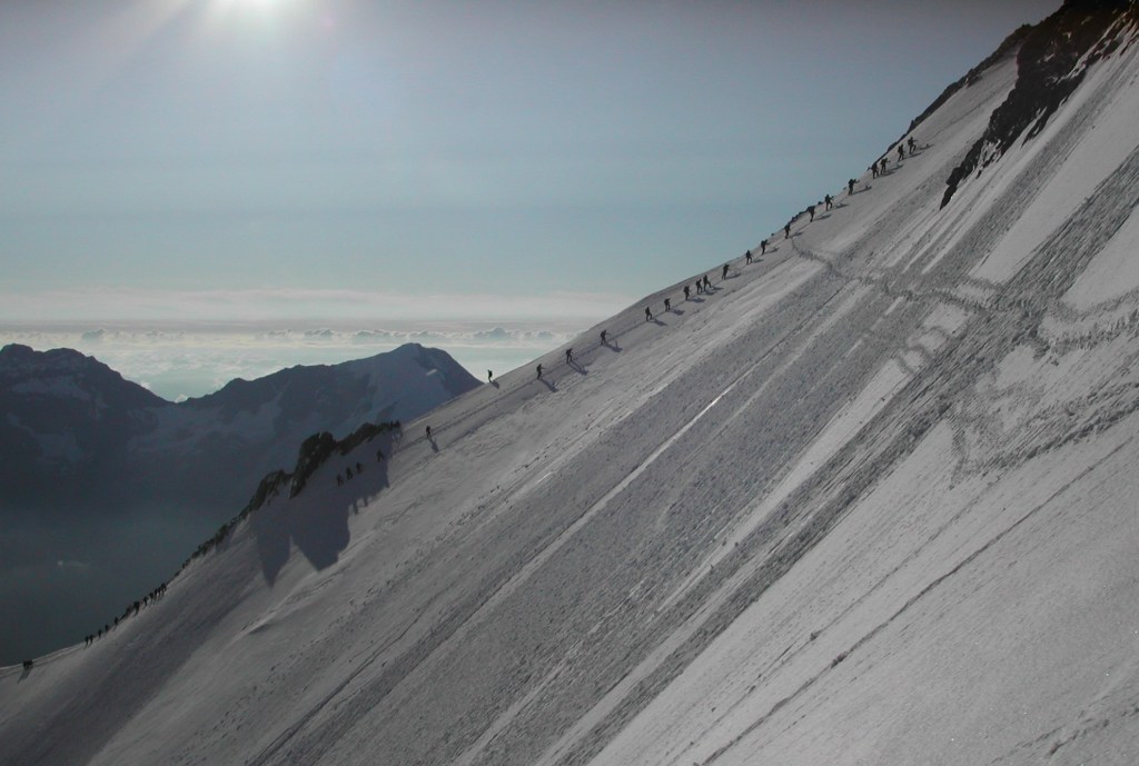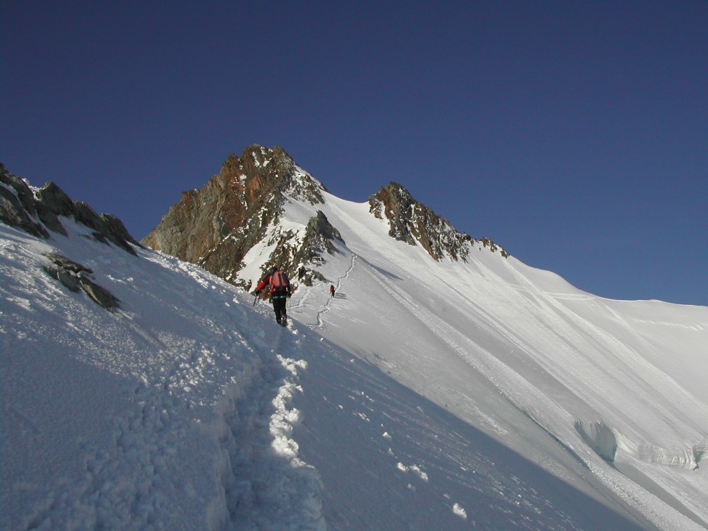 Caratteristiche: Grande classica, molto frequentata. L’avvicinamento si svolge su ghiacciaio più o meno crepacciato, a seconda della stagione, con un pendio ripido. La lunga cresta è estetica e aerea, abbastanza facile e in gran parte nevosa, con brevi tratti su roccia facile o misto. Ascensione con scarsi pericoli oggettivi, comunque da non sottovalutare e complessivamente abbastanza faticosa.