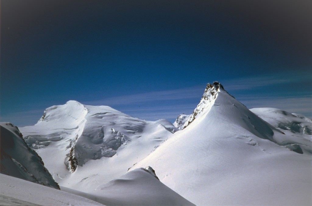 Salita: Dalla Britannia Hütte, 3039 m, scendere per circa 100 m fino a q. 2941 m sull’Ohlaub Gletscher. Attraversare il ghiacciaio in falsopiano in direzione sud e mettere piede sull’Allalin Gletscher. Risalire questo ghiacciaio sulla sinistra orografica in direzione ovest e poi sud-ovest costeggiando la parete rocciosa dell’Hohlaubgrat fino al grande ripiano a circa 3300 m. Svoltare gradatamente a destra e giungere, per un pendio più ripido, sull’ampia sella dell’Allalinpass, 3564 m. Traversare in piano il Mellich Gletscher, sul versante di Tasch, in direzione sud-est fino alla base della prima delle due costole che, dalla lunga cresta nord del Rimpfischhorn, scendono verso ovest. Perdere una trentina di metri di dislivello, all’inizio piuttosto ripidi, quindi traversare nuovamente fino a lambire le rocce della seconda costola (q. 3662 m). Svoltare a sinistra nel vallone glaciale racchiuso tra la parete nord-ovest del Rimpfischhorn e i tormentati pendii della q. 4001 m e risalirlo (crepacci) fino alla Rimpfischsattel, 3985 m, dove si lasciano gli sci (3.30 ore). Da qui la via non è intuitiva. Il canale di salita è quello di sinistra (il secondo da sud). A circa metà canale prendere a sinistra una cengia che porta ad una cresta secondaria. Proseguire su tale cresta fino ad una selletta da cui occorre portarsi a sinistra per imboccare un nuovo breve canale innevato, parallelo al filo di cresta. Salirlo (40-45°) fino al termine e da qui, con un passaggio di II+, portarsi sulla cresta principale. Superare una bella placca di 15 m (II) oltre la quale si giunge sull’anticima. Una spettacolare e aerea crestina la collega alla cima principale, 4199 m, sormontata da una croce (1-1.30 ore, totale 4.30-5 ore).