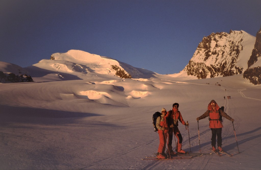 Alla croce di vetta arriviamo tra i primi, con tutta l’emozione di avere raggiunto il secondo ‘4000’ di questa uscita in Svizzera, in mezzo a quei colossi del Vallese che sempre abbiamo ammirato dalle montagne della Val d’Aosta. Scendiamo guardinghi verso il Feejoch sul pendio dall’apparenza innocua, ma dove ogni tanto occhieggiano delle sottili e pericolose fenditure. Passati gli spettacolari crepacci sotto il colle raggiungiamo rapidamente le piste e il carosello degli sciatori, tra i quali ci mescoliamo per raggiungere la Langflue Hütte, dove abbiamo prenotato per la notte. In confronto alla Britannia, qui sembra di essere tornati precocemente alla civiltà urbana. Il self service ricorda la mensa aziendale, dove il flusso degli impiegati è sostituito dal via vai di sportivi in attillate tute da sci. Fortunatamente, per dormire siamo sistemati nell’edificio della vecchia capanna che ha conservato le sembianze di un rifugio.