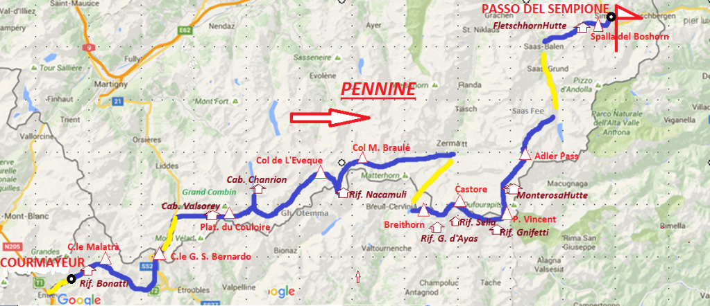 Risaliti dal Rifugio Nacamuli 2818 m al Col Collon 3087 m, scendere in direzione NE il Ghiacciaio di Arolla fino a contornare la base dello sperone della Vierge (q. 2920). Salire quindi in direzione E al Col di Mont Braulé 3220 m (il passaggio più orientale nella cresta che unisce i Bouquetins al Mont Braulé, 35-40° negli ultimi 100 m). Discendere in diagonale sul Ghiacciaio di Tsa de Tsan fino a circa 3080 m e percorrere il lungo falsopiano del ghiacciaio stesso. Con pendenza crescente risalire al Col de Valpelline 3562 m. Discendere lo Stokij Gletscher (crepacci) fino a circa 3100 m, e da qui svoltare in direzione S in un ampio corridoio glaciale per mettere piede sul Tiefmattengletscher. Percorrerlo (crepacci) in direzione NE e giungere sullo Zmuttgletscher. Scendere fino a q. 2480 da cui è possibile imboccare in direzione NO il Shonbielgletscher e raggiungere in breve la Shonbielhhütte 2694 m.